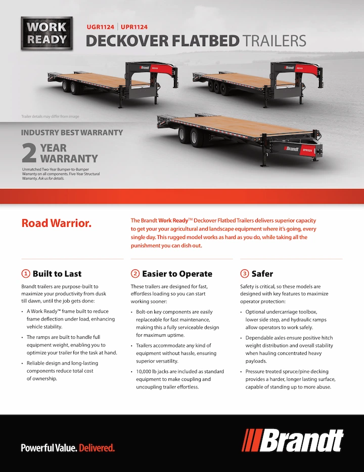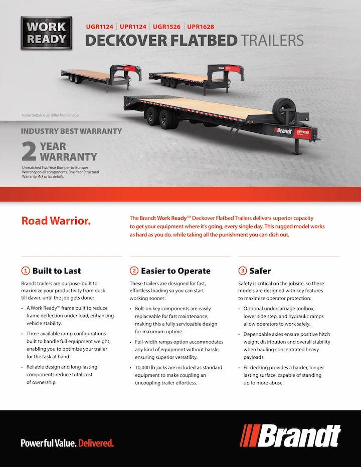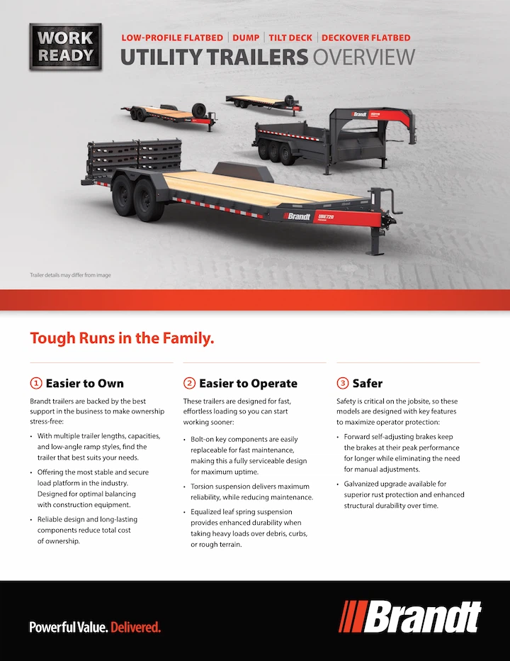 Work Ready™ Brandt trailers are purpose-built with durable components and the toughest powder-coat paint finish in the industry to maximize service life. And, they are covered by best-in-class warranty and a nationwide dealer network to ensure your trailer is always ready to work when you are.
