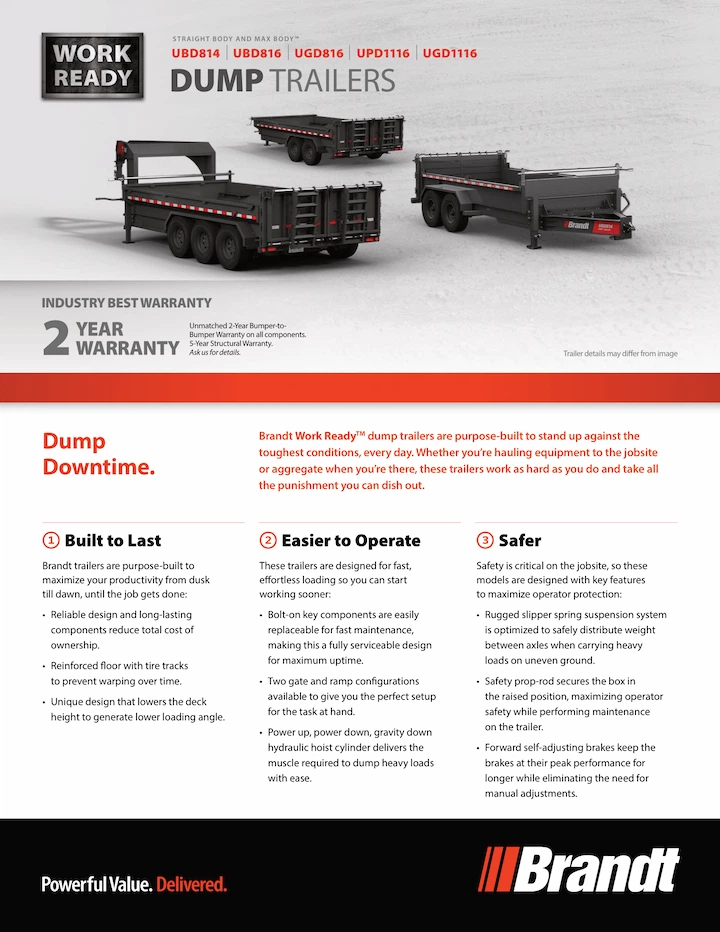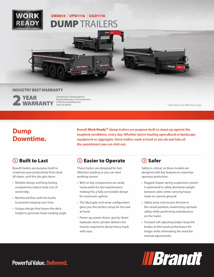Work Ready™ Brandt trailers are purpose-built with durable components and the toughest powder-coat paint finish in the industry to maximize service life. And, they are covered by best-in-class warranty and a nationwide dealer network to ensure your trailer is always ready to work when you are.