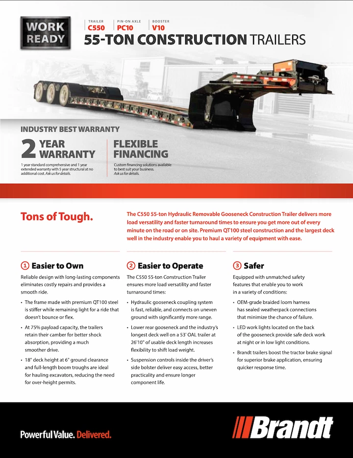 The C550 55-ton hydraulic removable gooseneck construction trailer delivers more load versatility and faster turnaround times to ensure you get more out of every minute on the road or on-site. Premium QT100 steel construction and the largest deck well in the industry enable you to haul a variety of equipment with ease.
