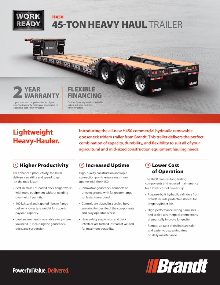 The H450 Commercial Hydraulic Removable Gooseneck Tridem Trailer from Brandt delivers the perfect combination of capacity, durability, and flexibility to suit all your agricultural and mid-sized construction equipment hauling needs. Complete with high-quality construction and rapid connection points to ensure maximum uptime, the H450 delivers the versatility and speed you need to get on the road faster.