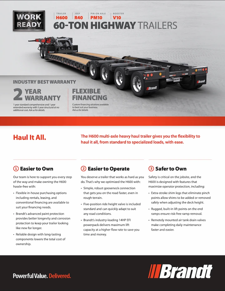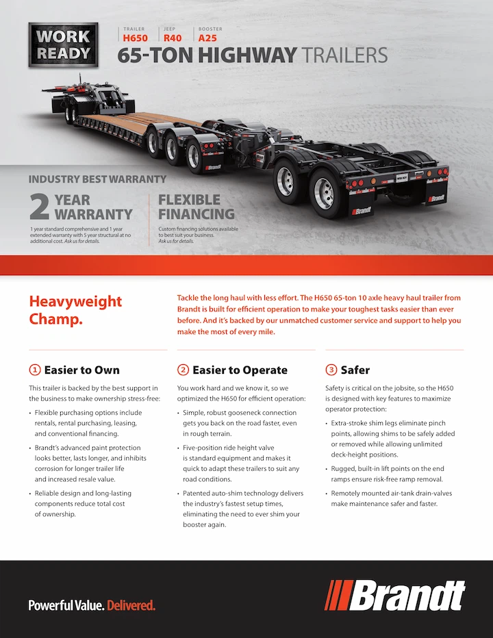 Introducing the all-new H650 10-Axle Heavy Haul Trailer from Brandt. This workhorse trailer is purpose-built to make the hardest jobs easier. It utilizes user-friendly booster connections, allowing you to easily hook up boosters without a crane, so you can hit the road sooner. And, the ramps include built-in lift ports for quick removal with a forklift and sling, saving you valuable time and increasing safety. What’s more, this productive unit leads the pack with an impressive 7ft of 5th-wheel slide for optimized handling with a wider range of equipment.