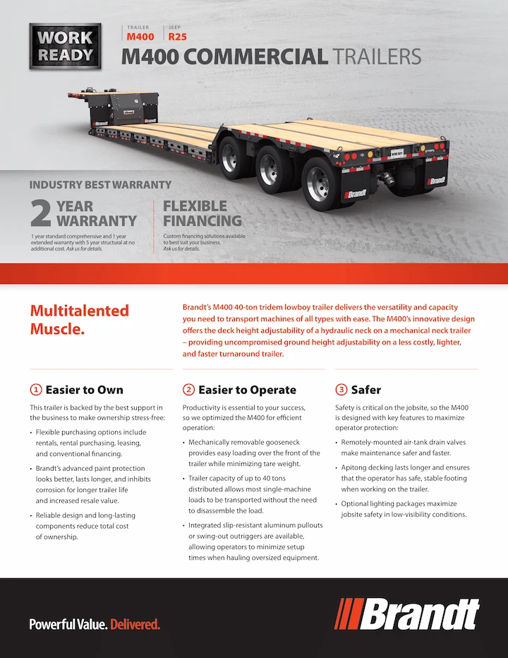 Leave the challenges of moving your machines in the dust with Brandt’s all-new M400 equipment hauler. This innovative trailer is more versatile with superior payload capacity compared to other models in its class, allowing you to maximize productivity wherever you’re working. The innovative gooseneck allows you to adapt this trailer and your truck to your payload while minimizing tare weight. And, the unmatched ground clearance of 5” at all fifth-wheel and jeep heights helps to eliminate the need for overheight permits, saving you time and money.