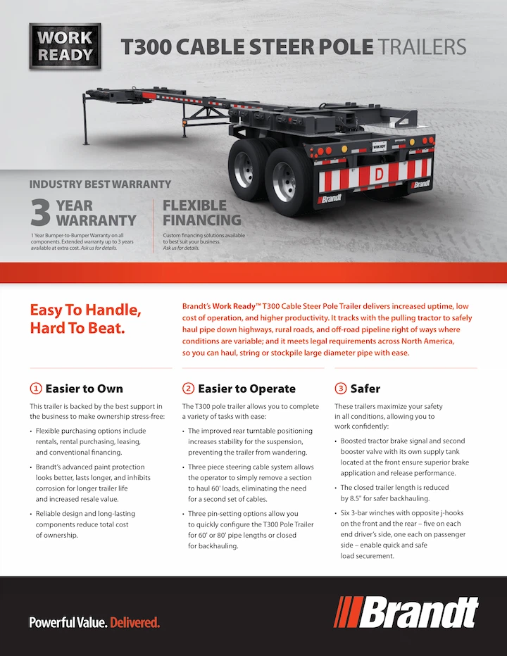 Brant’s Work Ready™ T300 cable steering pole trailer delivers increased uptime, low cost of operation, and higher productivity. It hauls pipe safely down highways, rural roads, and off-road areas where conditions are variable and meets legal requirements across North America, so you can complete a variety of tasks with ease. These units are designed to track with the pulling tractor, providing maneuverability that you won’t get with straight trailers. Plus, dual steer-lock pins hold the steering suspension straight for easier unloading.