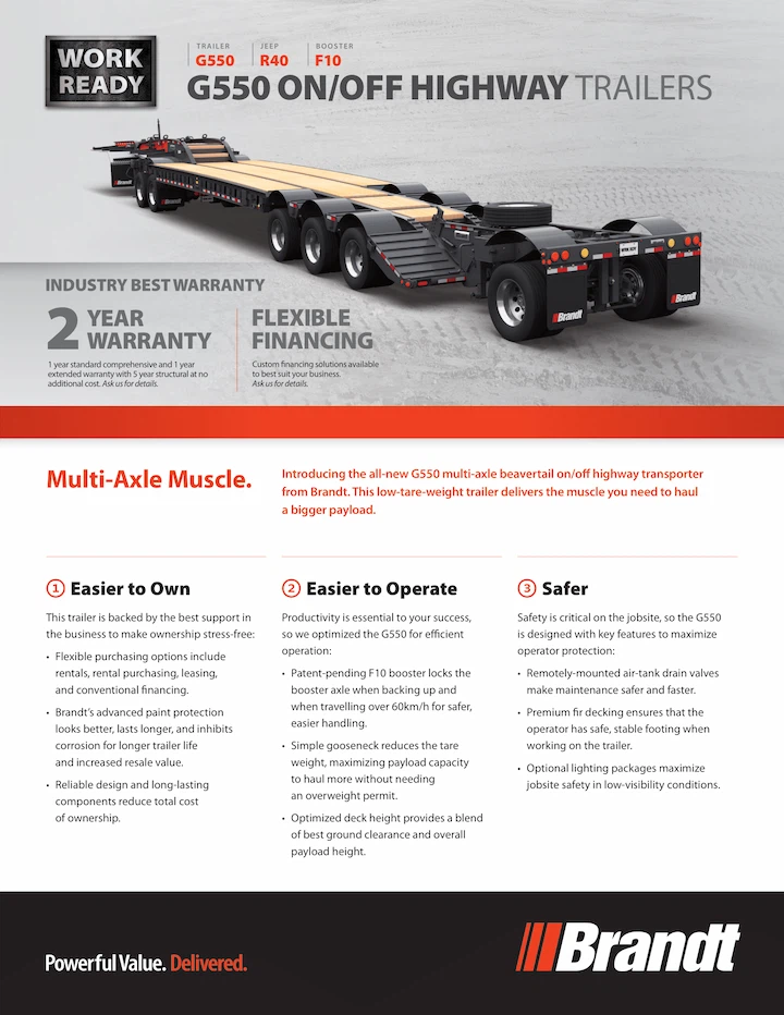 Brandt’s G550 multi-axle beavertail on/off highway transporter delivers the muscle you need to haul more with each trip. The fixed gooseneck reduces tare weight compared to hydraulic models, freeing up capacity to carry a bigger payload. Its optimized design allows the payload to be positioned further forward to transfer more weight to the tractor and steer axle. And, the gooseneck’s low profile creates more space on the deck to easily accommodate bulky cargo.