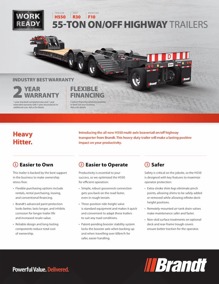 Brandt’s H550 multi-axle square tail on/off highway transporter makes light work of your heavy payloads. Its low tare-weight design is optimized to haul more without the need for permits. And, the low-profile gooseneck allows you to position your load further forward to maximize deck space. Combine a 14 HP EFI engine that delivers a 57% faster flow-rate with unimpeded lift capacity and you have a complete transport solution will pull its weight — and then some..