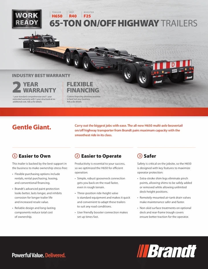 The all-new H650 multi-axle beavertail on/off highway transporter from Brandt pairs maximum capacity with the smoothest ride in its class. Its low-profile gooseneck allows you to position your load further forward to utilize more deck space. And, the 14 HP EFI engine delivers a 57% faster flow-rate with unimpeded lift capabilities, effortlessly handling heavy loads. All of that rests on a durable air suspension system for unmatched stability that protects your payload and makes big jobs a breeze.